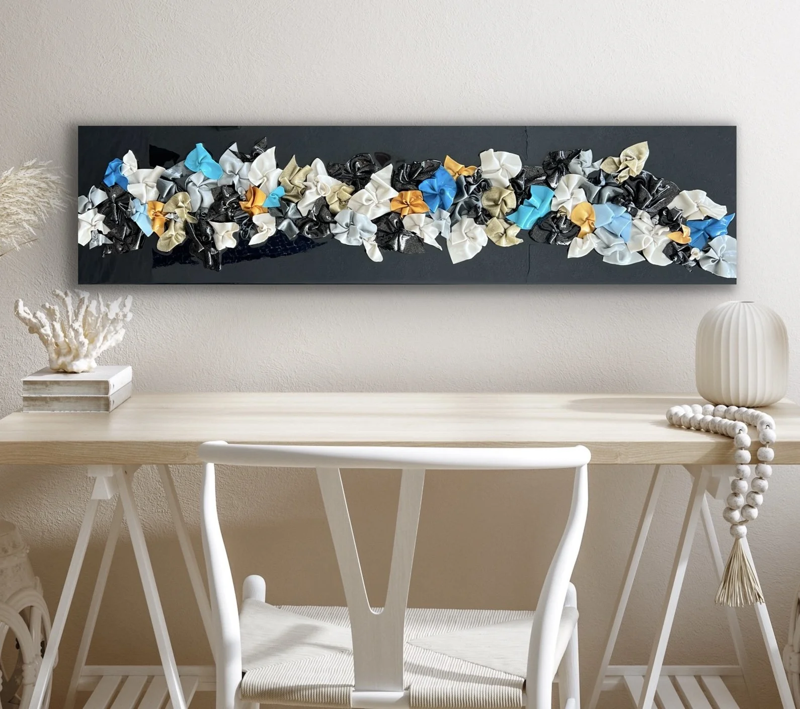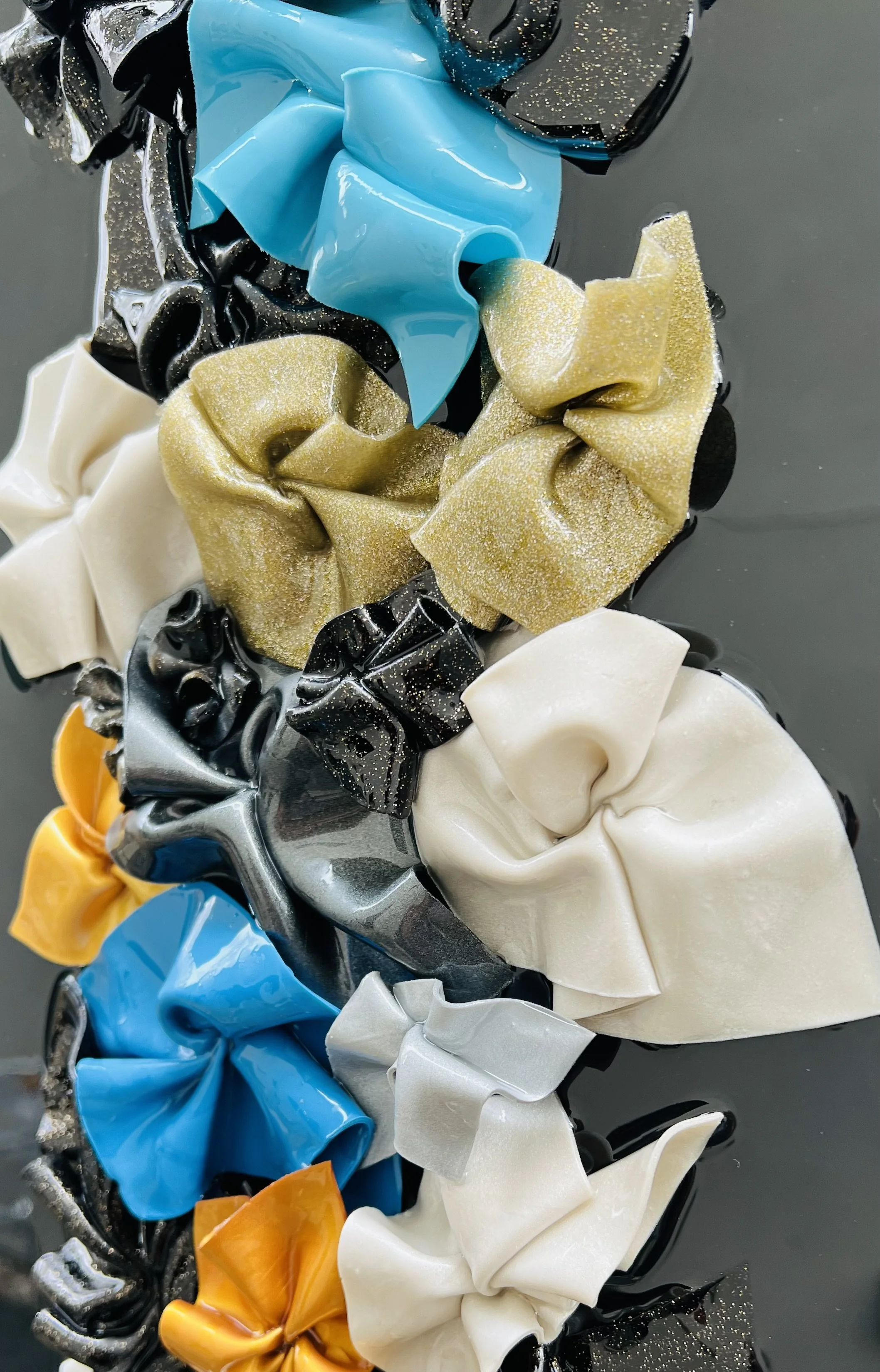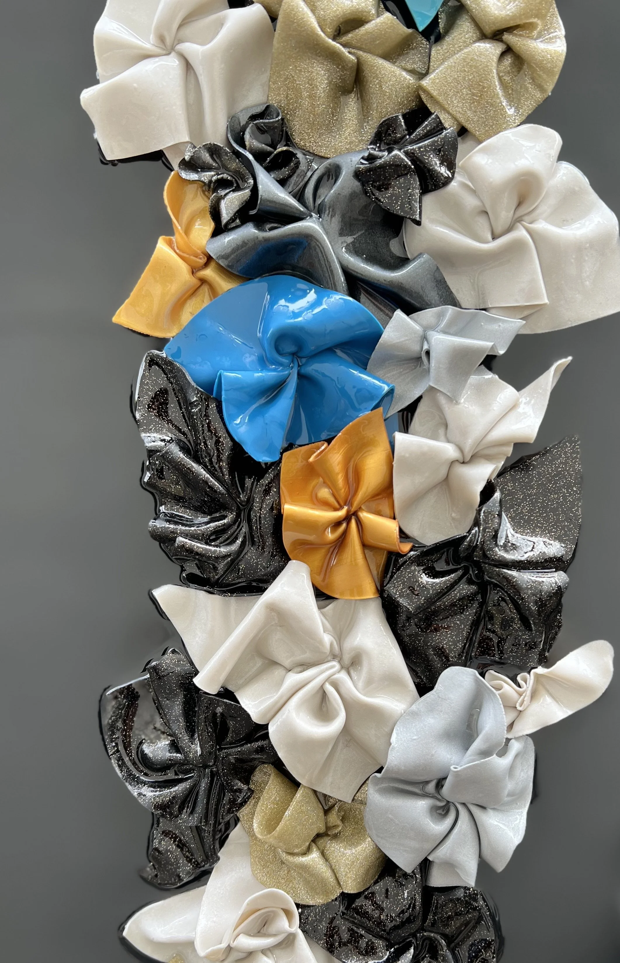 Colorful sculpture with a black base, creates a beautiful piece. Hang it vertical or horizontal.